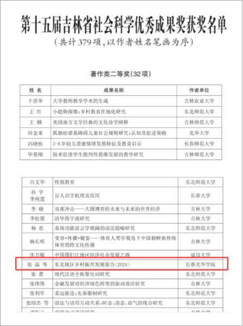 近日,吉林省社会科学优秀成果评奖管理办公室公布了第十五届吉林省社会科学优秀成果奖评选结果,长春光华学院张磊院长等的研究成果《东北地区乡村振兴发展报告(2024)》荣获专著类二等奖。这是学校首次获得吉林省哲学社会科学专著类奖项。